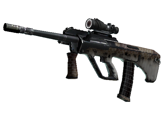 Powerful and accurate, the AUG scoped assault rifle compensates for its long reload times with low spread and a high rate of fire. It has been painted using a copperhead snakeskin-patterned hydrographic.
